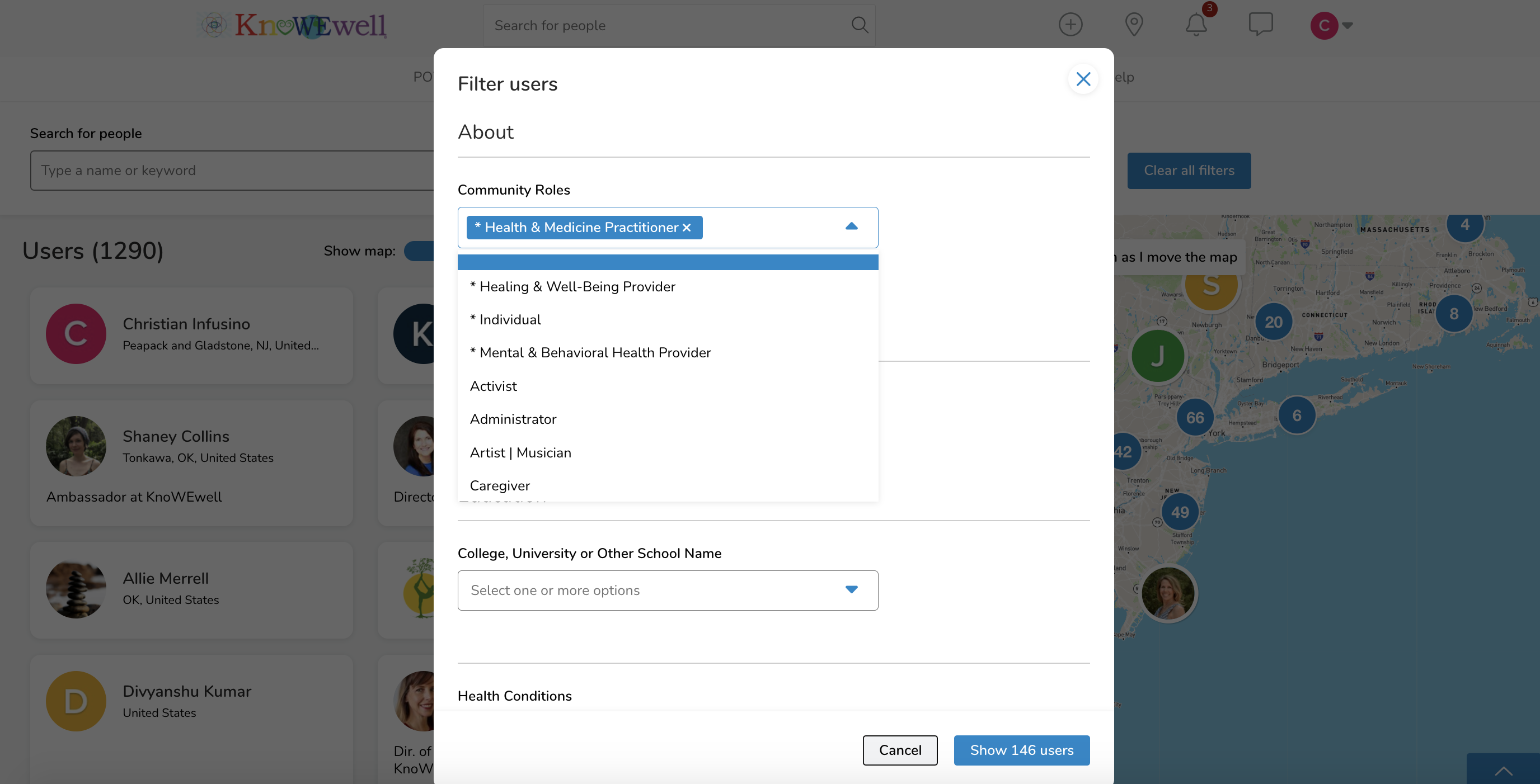 You can search only practitioners of your selected therapy by clicking on 'More Filters'. Community Role Cluster identifies a member's current role in the KnoWEwell Community, Health & Well Being provider, Health & Medicine provider, Individual member, volunteer, etc. You use this filter to find a certified practitioner for your search.