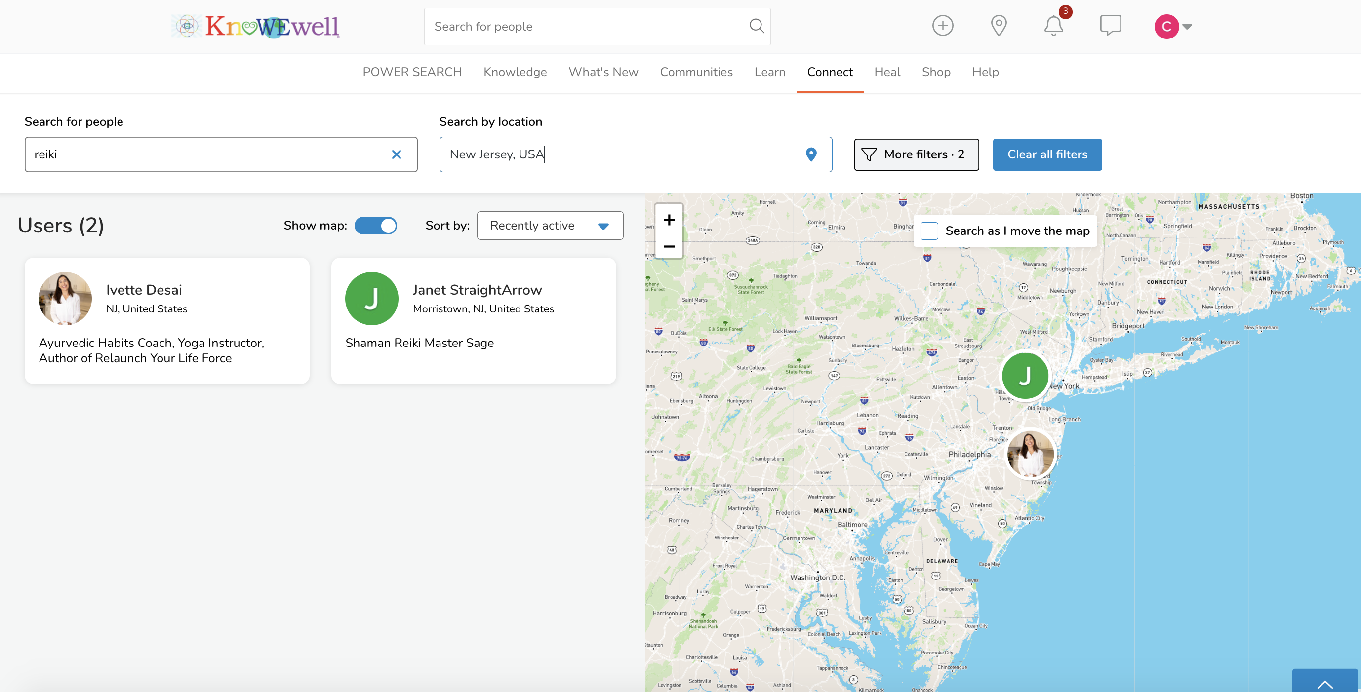 You can also search by keyword, for example: "Reiki". Community members who are practitioners certified in Reiki or individual members who are interested in Reiki therapy are listed on the left. You can then refine your search by entering a preferred location.
